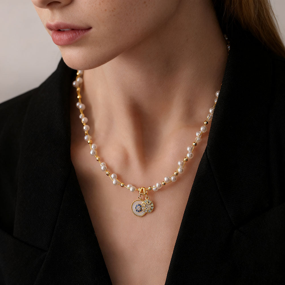 The radiant Aurora Pearl catches the light with soft iridescent hues, giving your neckline a subtle glow that suits both everyday wear and special moments.