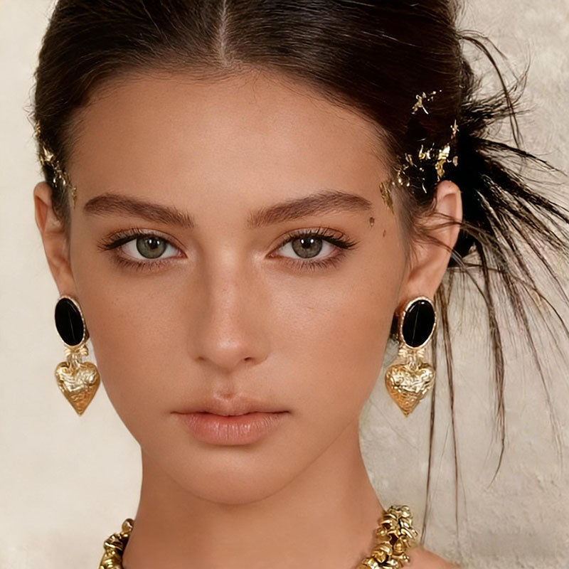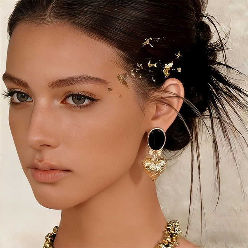 A delicately sculpted heart rests within a smooth, elongated oval—blending antique artistry with modern refinement. The lightweight drop design creates a graceful vertical line that enhances your natural elegance, while the satin-sheen finish adds a soft, luminous glow. Thoughtfully crafted for comfort and sophistication, these earrings bring a polished, elevated touch to any look—from minimalist daily wear to evening silhouettes.